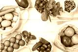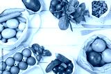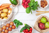 Textile and paper bags with vegetables and fruits and reusable bamboo kitchen utensils top view. Zero waste food shopping, eco friendly and plastic free concept.
