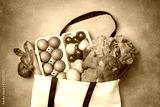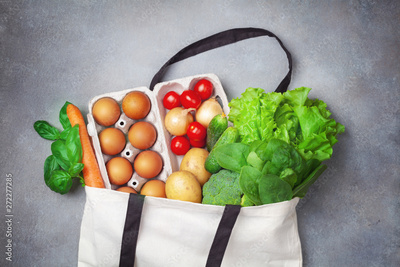 Fresh vegetables and fruits in natural eco friendly cotton bags top view. Zero waste food shopping and plastic free concept.