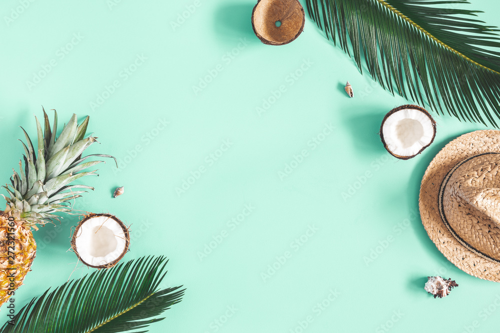 Summer composition. Tropical palm leaves, hat, fruits on mint background. Summer concept. Flat lay, top view, copy space