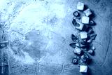 Ice cubes with fruit and broken ice on a stone blue background with mint leaves and fresh fruit. Mint, strawberry, cherry, lemon, orange. Flat lay, top view
