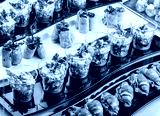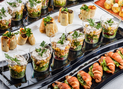 Mini appetizers with salmon fish, caviar, cheese, prawn, shrimp and greens on banquet table. Gourmet food close up, snack, antipasti, Seafood platter