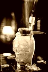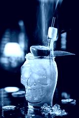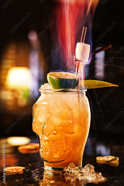 Flame over citrus alcoholic drink with lime and ice in glass of shaped skull backdrop of the restaurant atmosphere. Summer drinks and cocktails, splashes and drops