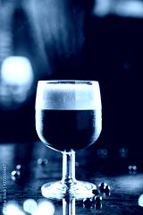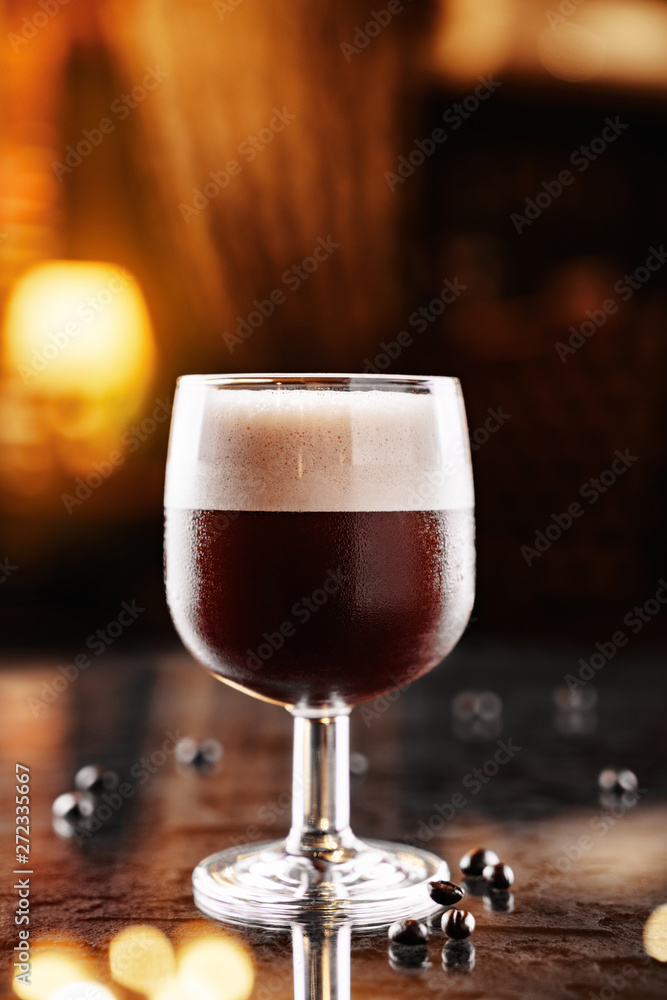 Cold alcoholic cocktail with coffee in tall glass on backdrop of the restaurant atmosphere. Summer drinks and cocktails