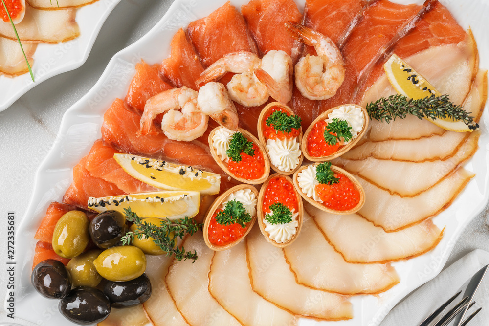 Seafood platter with salmon slice, pangasius fish, red caviar, shrimp, decorated with olives and lemon on marble background. Mediterranean appetizers, top view