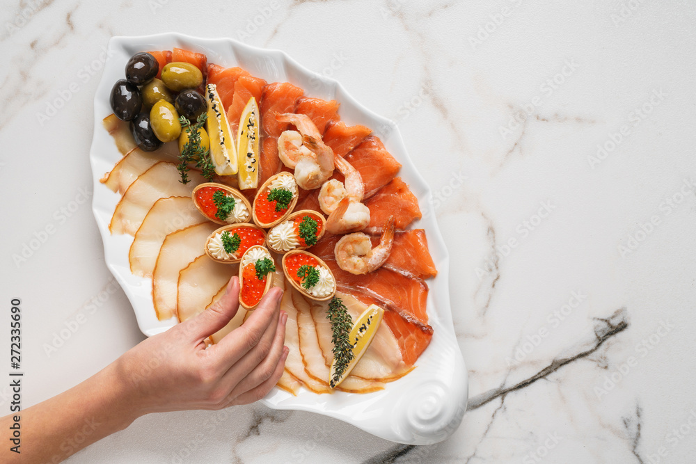 Seafood platter with salmon slice, pangasius fish, red caviar, shrimp, decorated with olives and lemon on marble background. Mediterranean appetizers, top view