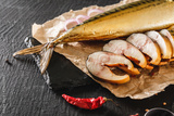 Appetizing smoked mackerel fish with spices, pepper and bread on craft paper over dark stone background. Mediterranean food, herring fish, seafood, close up
