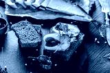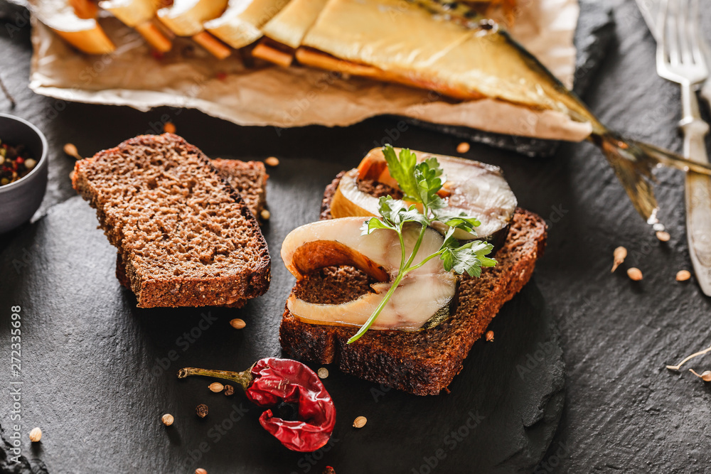 Sandwich with smoked mackerel fish with spices on dark stone background. Smoked fish, mediterranean food, herring fish, seafood, selective focus
