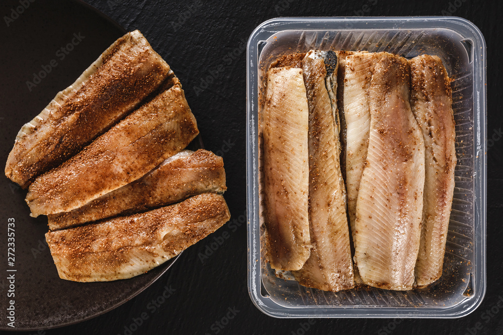 Marinated fillet mackerel or fillet herring fish with spices packed in box on plate over slate stone background. Mediterranean food, appetizer, seafood, top view
