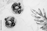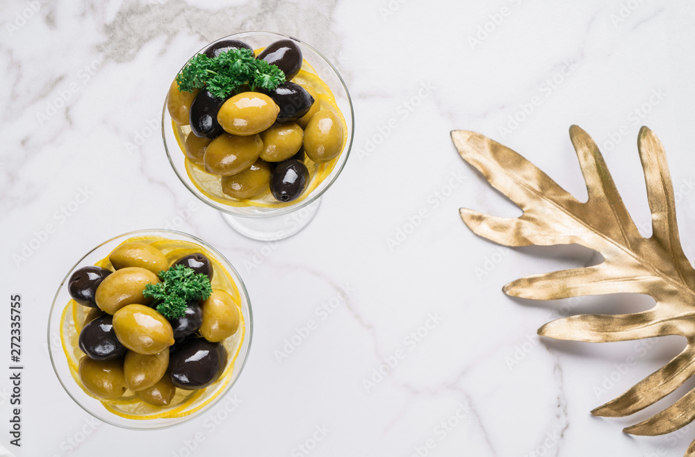 Black and green olives in glass on white marble background. Various kinds of Mediterranean pickled olives. Top view