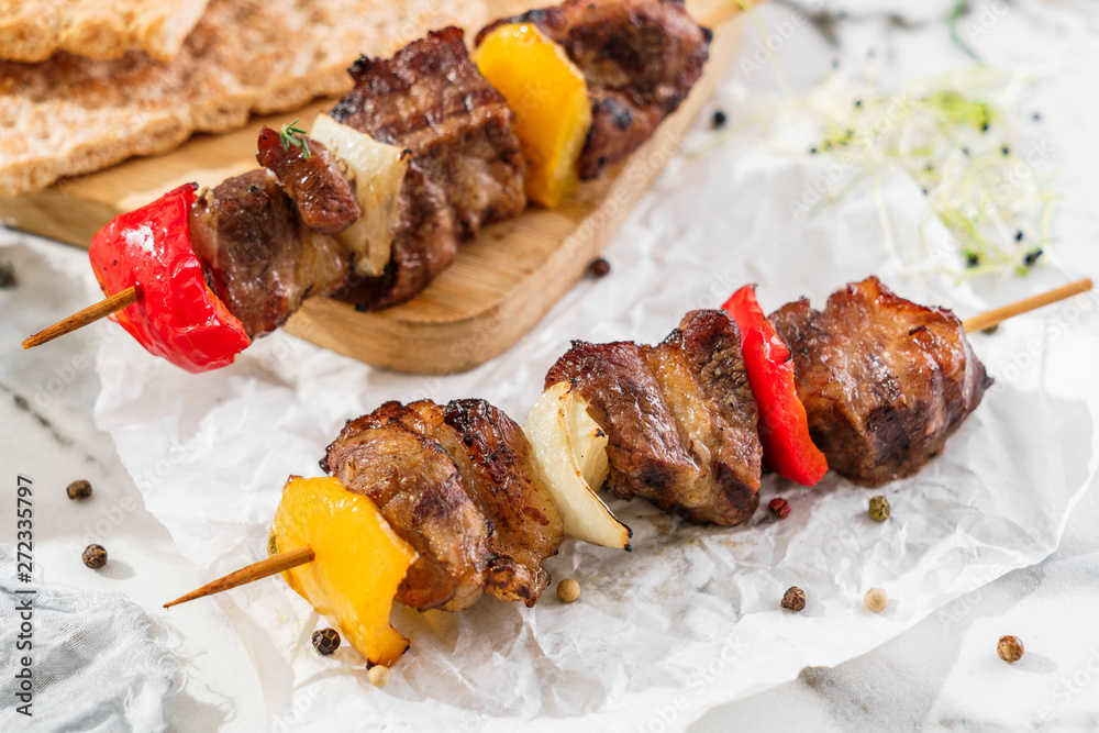 Grilled meat shish on skewers with vegetables on paper over light table. Healthy food. Hot meat dishes, shashlik food, closeup