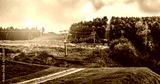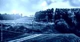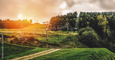 Beautiful landscape of summer mountains. A view of the forested slopes of the mountains with evergreen conifers and chair lift. Travel background, toning