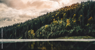 Forested mountain slope with evergreen conifers and lake shrouded in mist in a scenic landscape view. Sunset in mountains. Tourism concept. Season autumn. Travel background