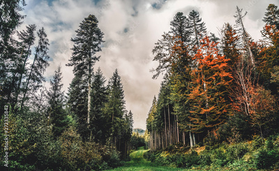 Beautiful forest landscape in autumn mountains. Lifestyle wanderlust adventure. Travel background