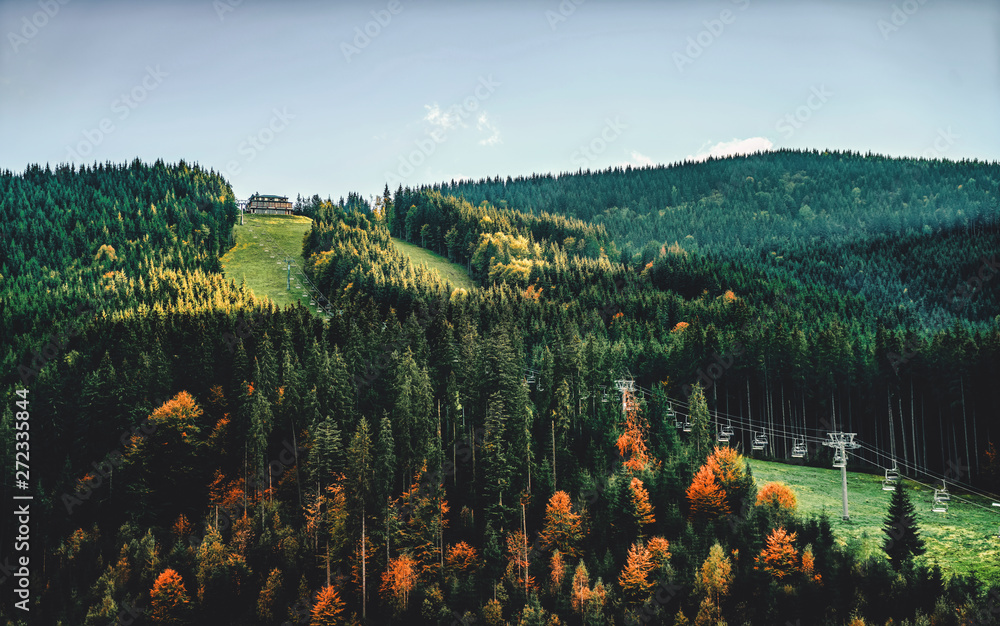 Majestic landscape of summer mountains. A view of the forested slopes of the mountains with evergreen conifers and chair lift. Sunny day with blue sky. Travel background. Large panorama, toning