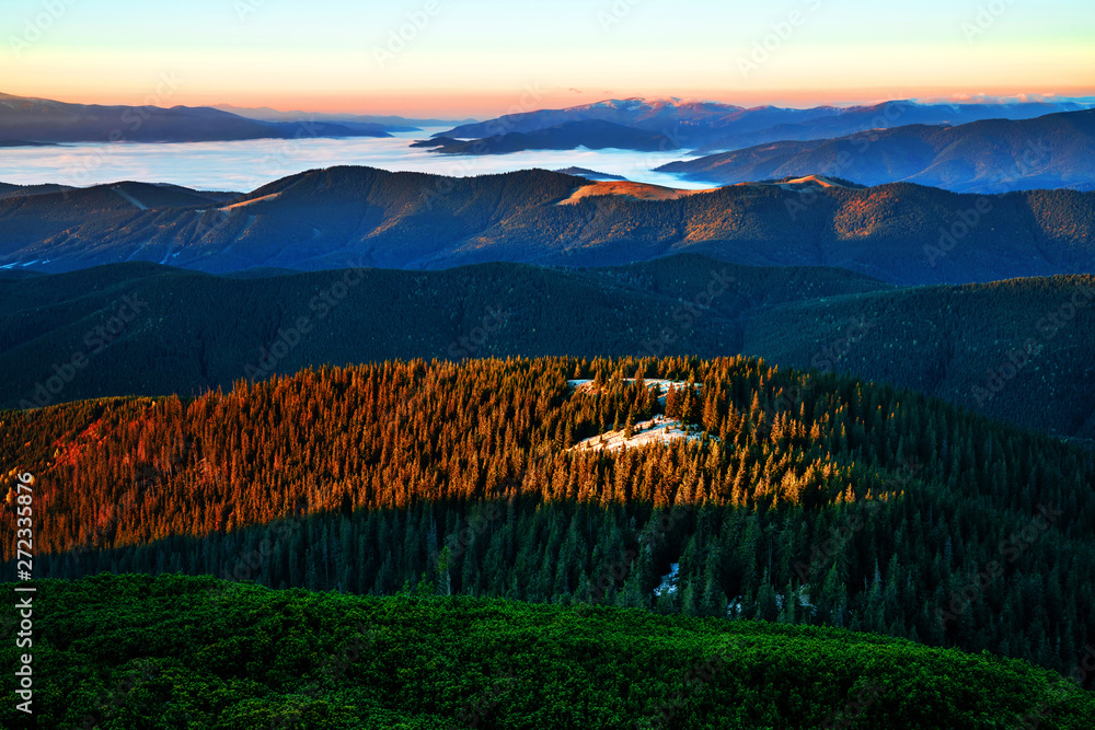 Beautiful dawn in the mountain range. Mountains shrouded in mist in a scenic landscape view. Location Carpathian mountains, Europe. Travel background