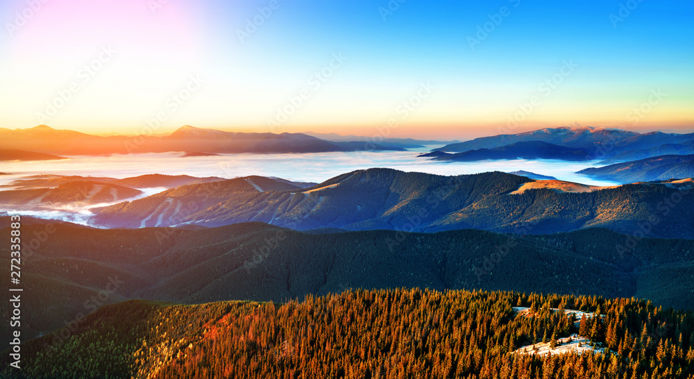 Beautiful dawn in the mountain range. Mountains shrouded in mist in a scenic landscape view. Location Carpathian mountains, Europe. Travel background