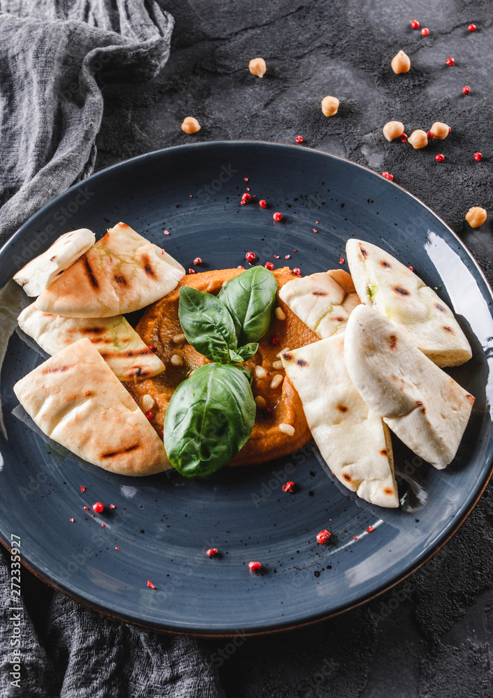 Chickpeas hummus with olive oil, paprika, pine nuts and pita bread in a ceramic plate over grey background. Healthy vegan food, clean eating, dieting, top view