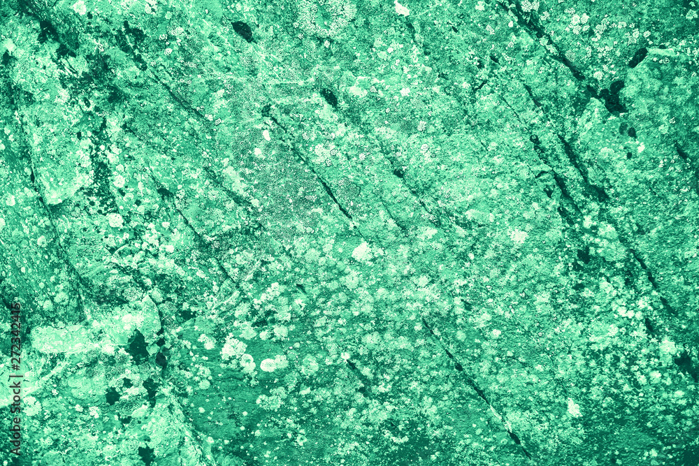 Vintage green background. Rough painted wall of emerald color. Imperfect plane of virid colored. Uneven old decorative toned backdrop of green tint. Texture of emerald hue. Ornamental stony surface.