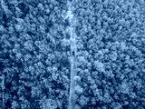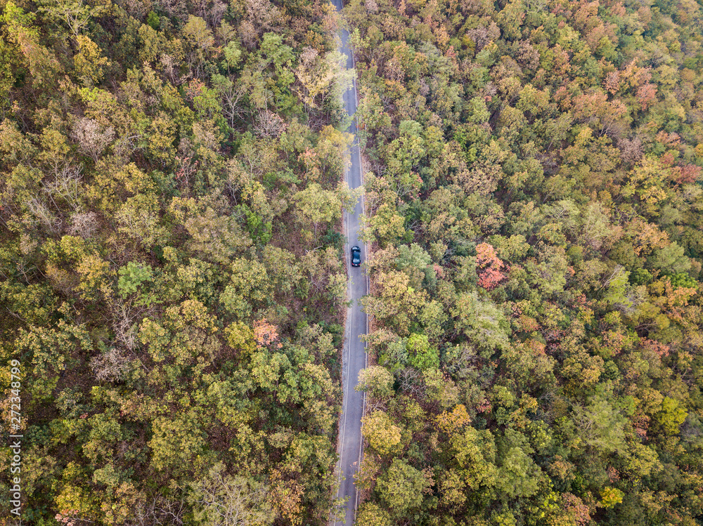 Aerial view of thick forest on the hills with road cutting through in the countryside of Northern Thailand.