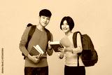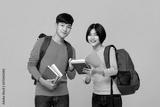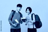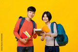 Smiling Asian college student friends with backpacks holding books