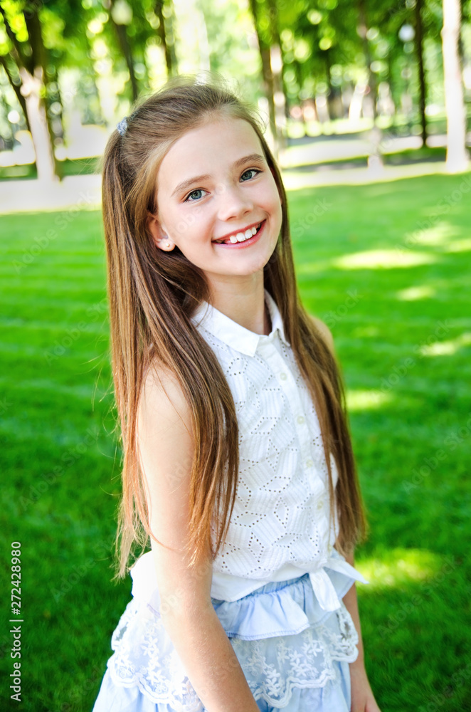 Portrait of adorable smiling little girl child schoolgirl teenager outdoors
