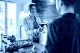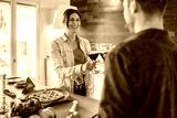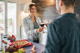 Engaged couple at a time of intimacy at home - Boyfriend and girlfriend toast with a glass of red wine - Wife and husband in their new home