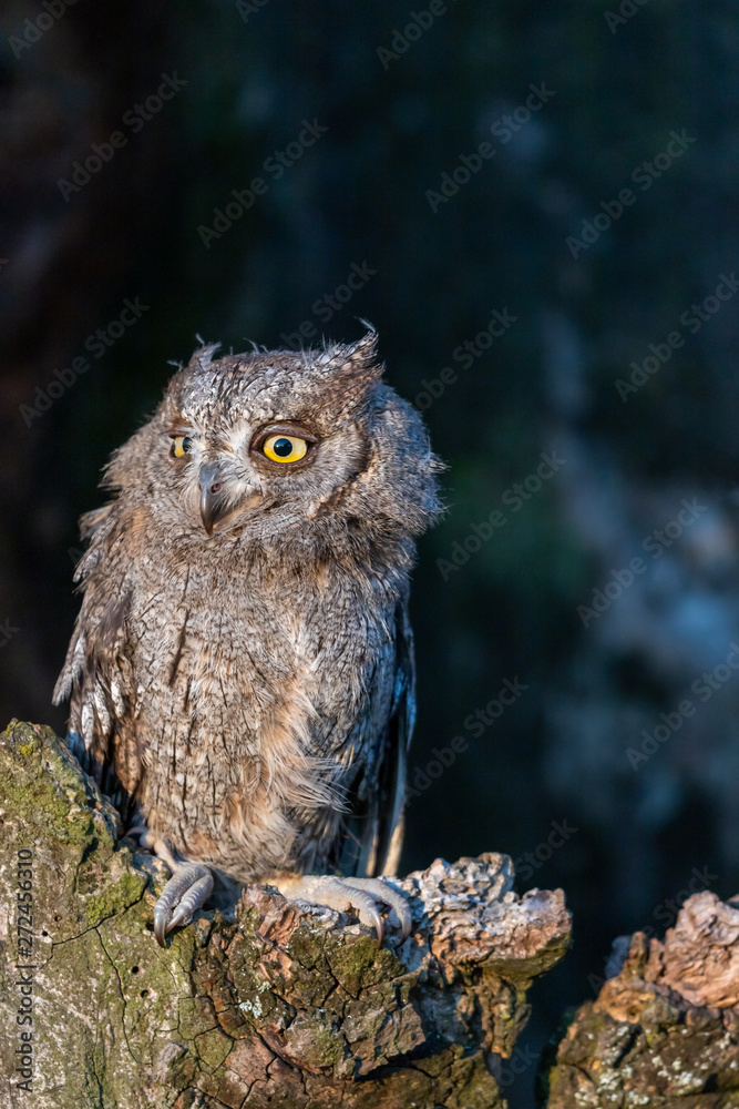 Portrait of otus scops standing in a tree hollow and looking at the side.