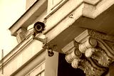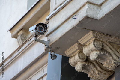 CCTV camera attached on the wall of the building, monitoring and tracking, monitoring the situation