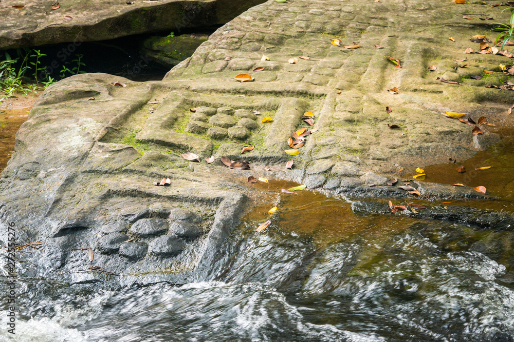 Group of sandstone Lingas (Symbol of Hindu god) shape like a lotuses at Kbal Spean waterfall on Kulen mountain range in Siem Reap, Cambodia.