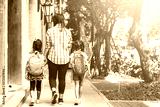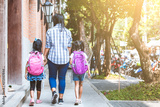 Back to school. Asian mother and daughter pupil girl with backpack holding hand and going to school together