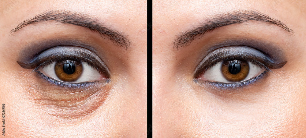 A closeup view on the eye of a beautiful young Caucasian woman, before and after blepharoplasty surgery, plastic surgery which corrects deformities around the eye such as eye bags shown here.