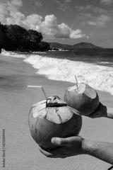 Men's Hands Hold Two Fresh Coconut Cocktails on the Beautiful Beach at Sunny Day.