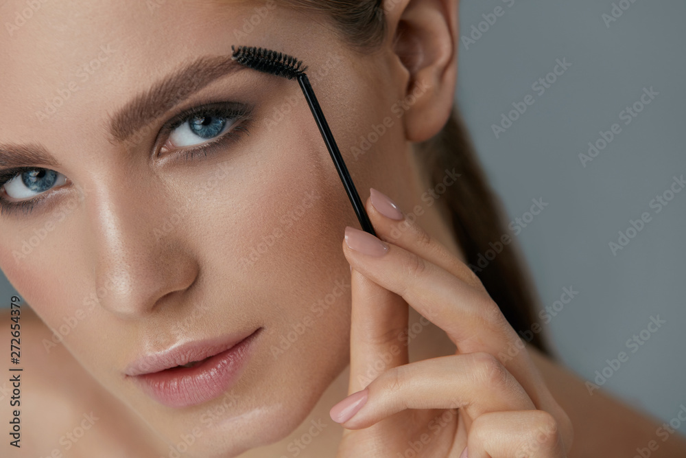 Eyebrow makeup. Woman brushing brows with gel brush closeup