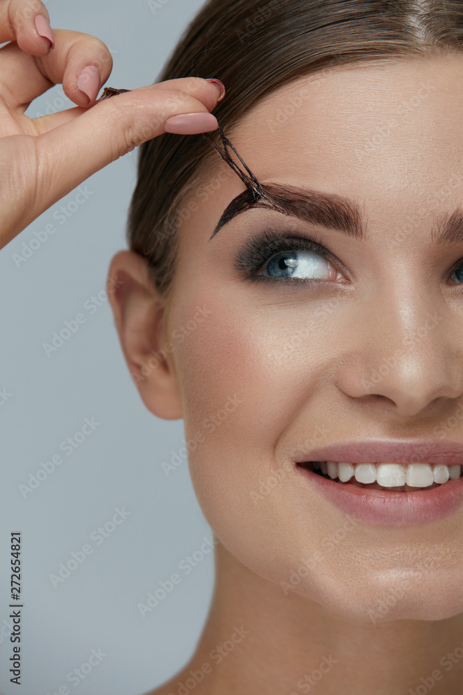 Eyebrow cosmetics. Woman taking off brow gel tint from eyebrow