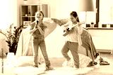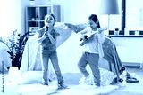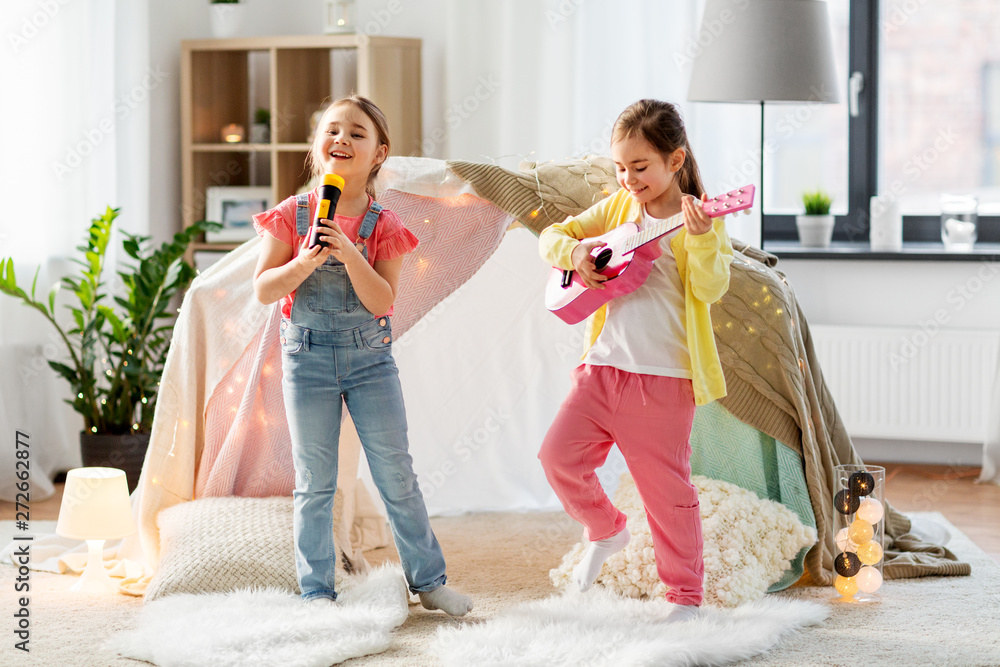 childhood, hygge and friendship concept - happy girls with guitar and microphone playing music and singing near kids tent or teepee at home