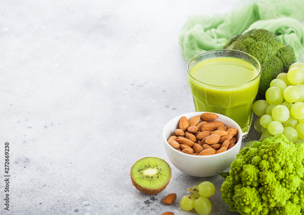 Glass of fresh smoothie juice organic green toned fruit and vegetables on stone kitchen background. With almond nuts in bowl. Space for text