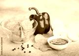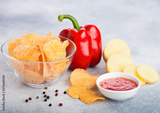 Glass bowl plate with potato crisps chips with paprika on light table background. Red paprika pepper with potatoes and sweet chilli sauce.