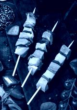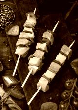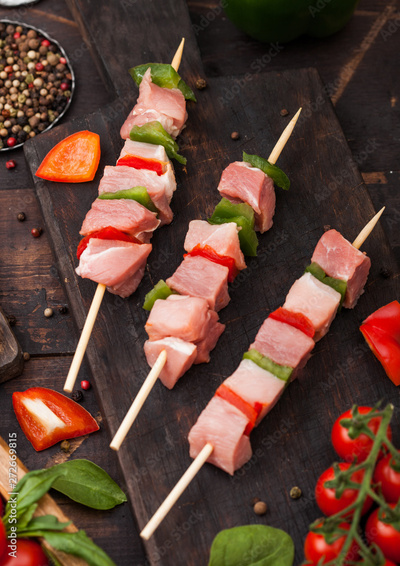 Raw pork and chicken kebab with paprika on chopping board with salt and pepper on wooden background.
