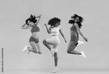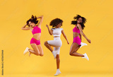 Three strong and happy athletic women, jumping or dancing on yellow background wearing color sportswear. Fitness and sport motivation.