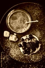 Coffee and chocolate cake with berries on a dark plate. Breakfast, coffee and dessert