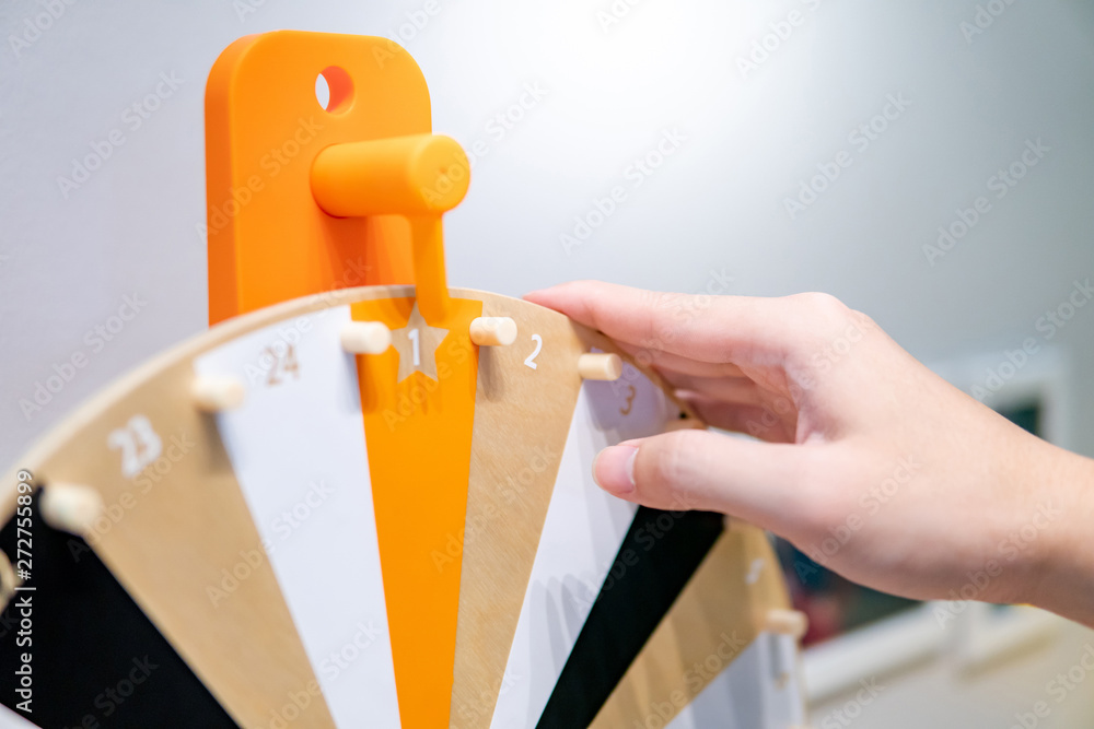 Male hand spinning wooden wheel of fortune. Luck and risk game. Entertainment gaming concept