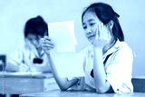 Smile young girl student reading and writing exam with not stress.