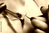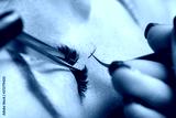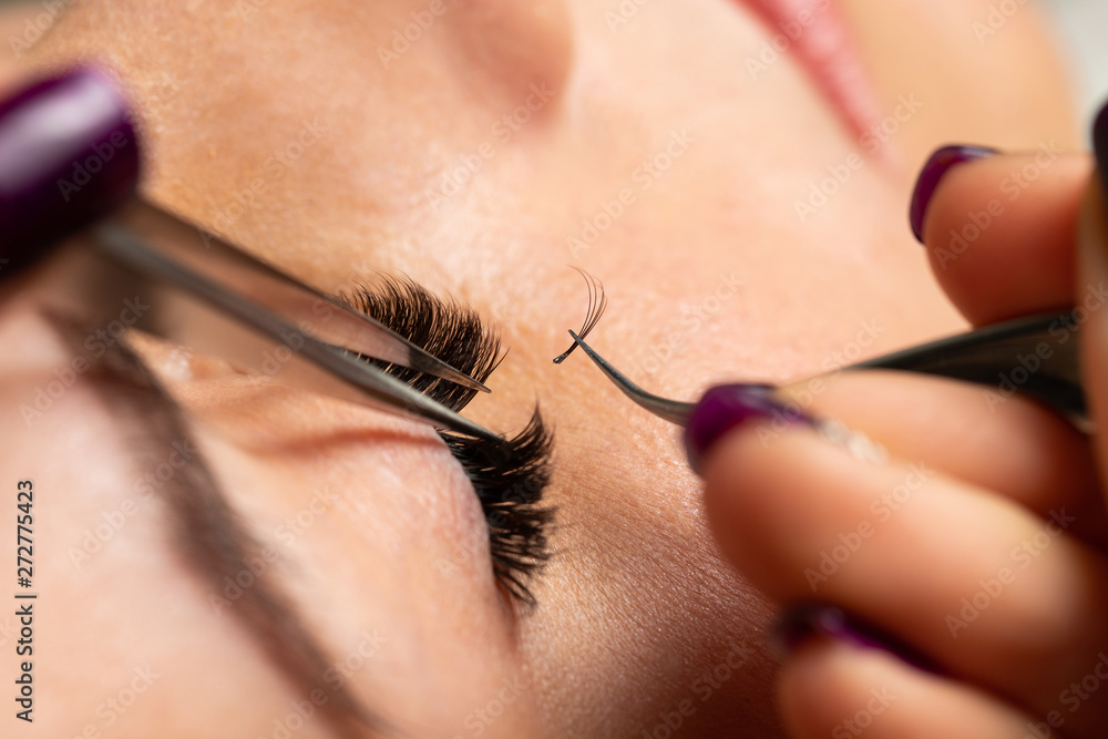 The master builds up large colored eyelashes to the client. Preparation for beauty photography. Creating an image.