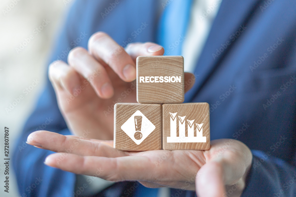 Recession market finance business concept on wooden cubes pyramid in businessman hands.