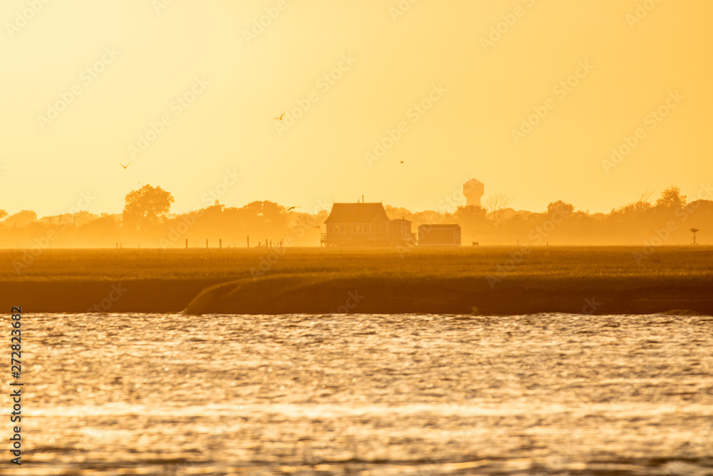 Golden light shining on a small bay house on the water at sunset. Long Island New York.
