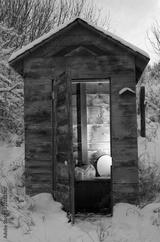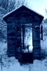 Snowy day outhouse with the toilet seat up and no one around
