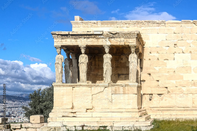 The famous Porch of the Caryatids or the Maidens on the south side of the Erechtheion or Erechtheum an ancient Greek temple on the north side of the Acropolis of Athens in Greece dedicated to Athena