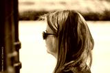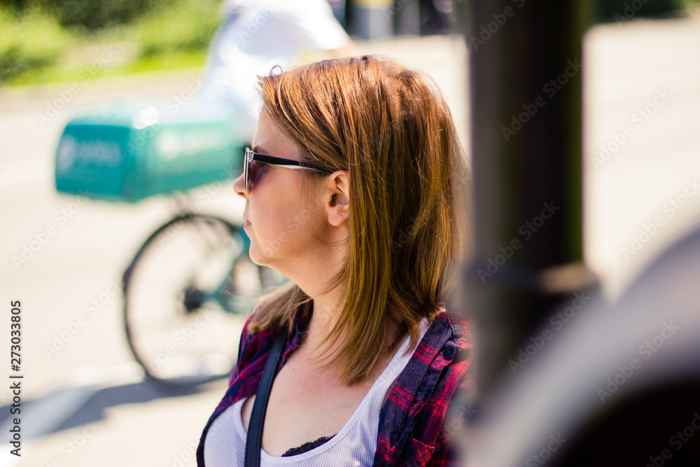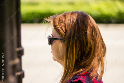 Young woman with short brown hair and a black pair of sunglasses sitting in the bright got sun – Girl enjoying summertime outdoor in the park