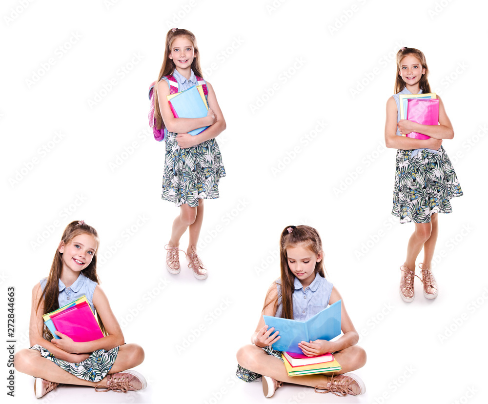 Collection of photos portrait of cute smiling happy little school girl child teenager with school bag backpack and books isolated