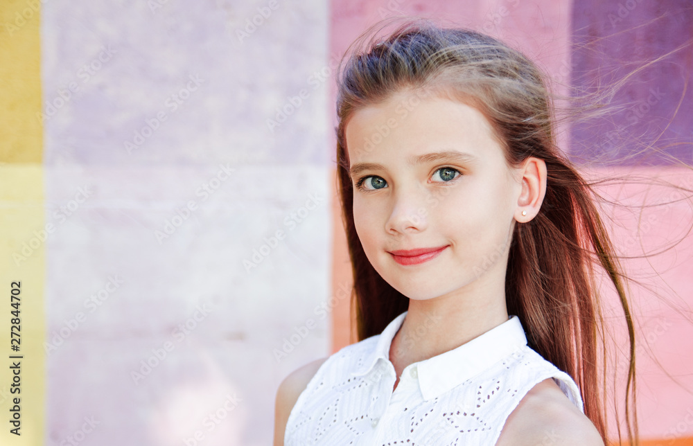 Portrait of adorable smiling little girl child schoolgirl teenager outdoors